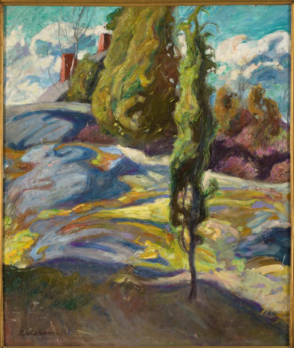 Petit Palais’ssa avautuva näyttely esittelee Pekka Halosen ainutlaatuista luontosuhdetta ja elämää taiteilijayhteisössä. Lahden kaupungintalolta näyttelyyn lainattava kertoo molemmista. Maalauksessa jylhällä kalliolla kasvavien katajien lomasta pilkistää talon katto, jonka savupiiputkin istuvat luonnonmaisemaan. Kyseessä on taiteilijan hartaudella suunnittelema ateljeekoti Halosenniemi, joka rakennettiin Tuusulanjärven rannalle 1899–1902.